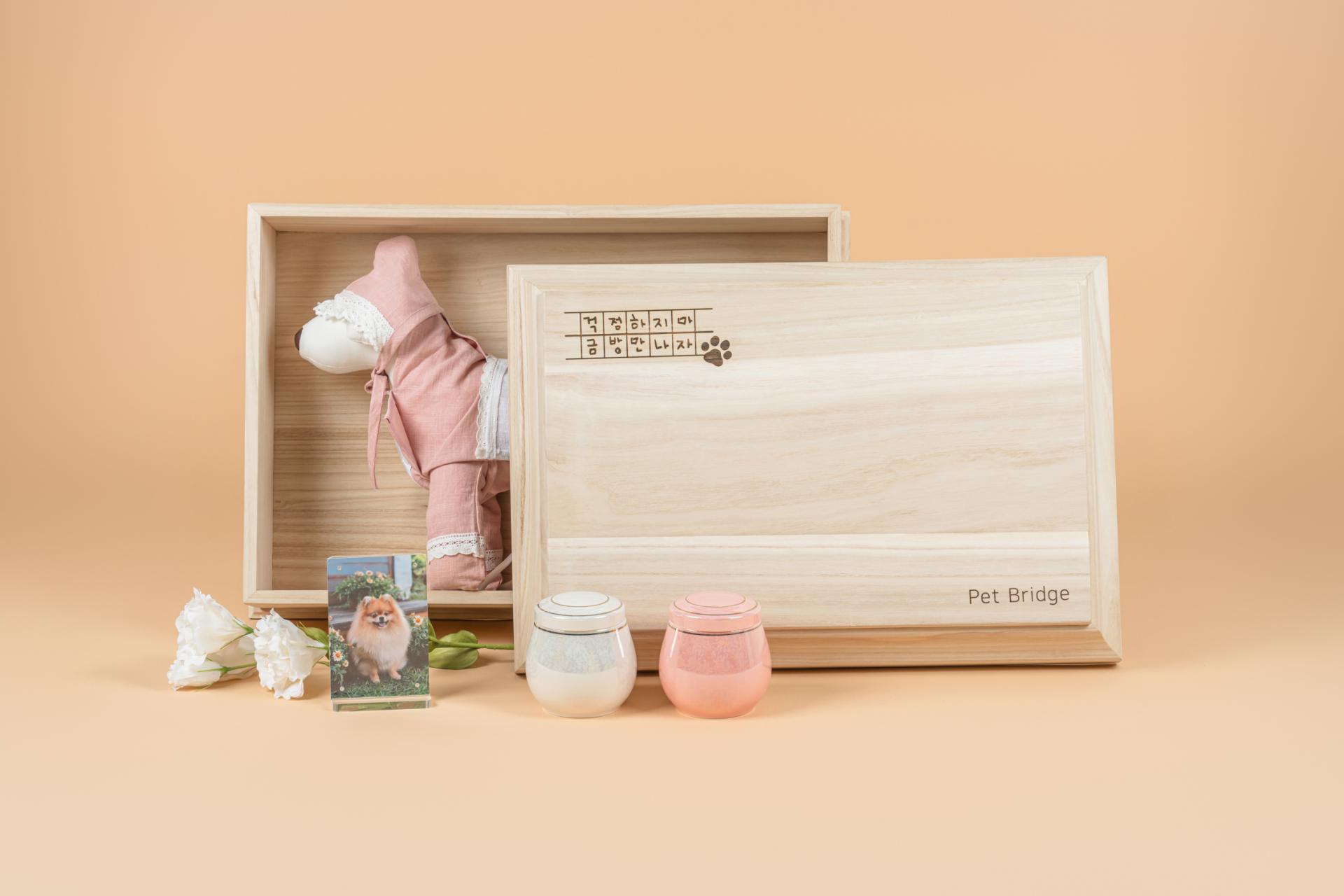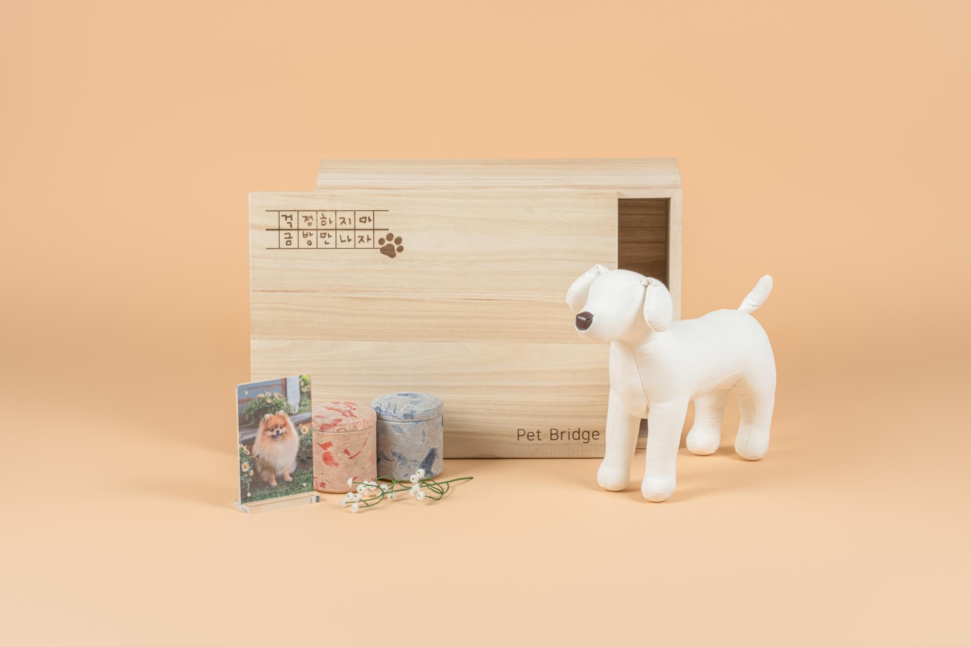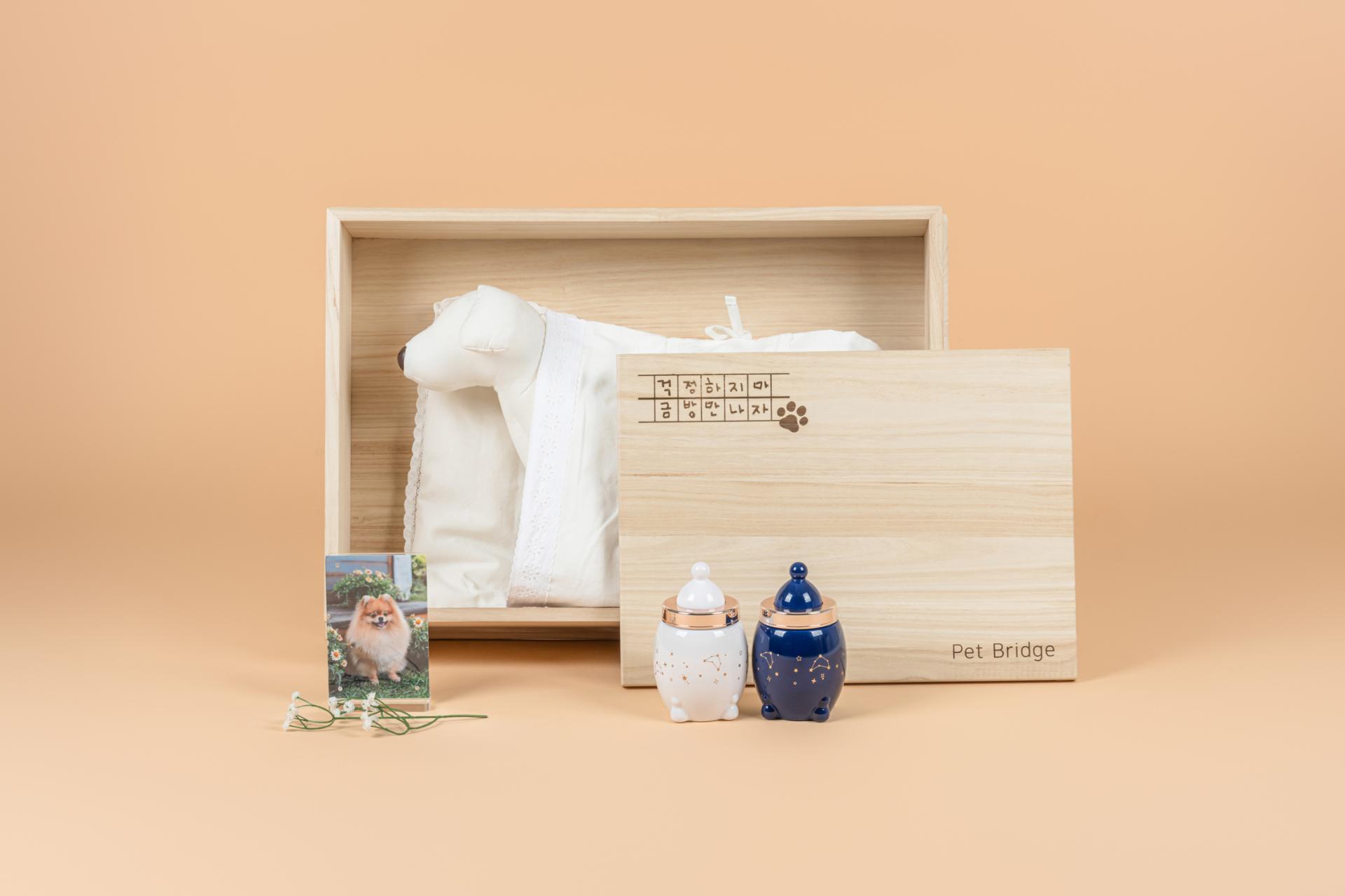 사랑하는 아이에게 보내는 마지막 포근한 안녕, 부드러운 천연 순면 이불보, 반짝이는 기억을 담을 기능성 유리 유골함, 그리고 오동나무로 정성껏 만든 관이 포함된 펫브릿지의 대표 장례 서비스입니다. 마지막 순간까지도 따뜻함을 느낄 수 있도록, 정성과 마음을 담아 함께합니다.